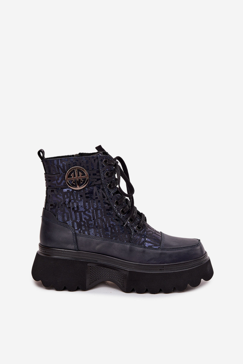 Skórzane Botki Damskie Na PlatformiewithNapisami I Ozdobnym Detalem Artiker 57C2271 Granatowe