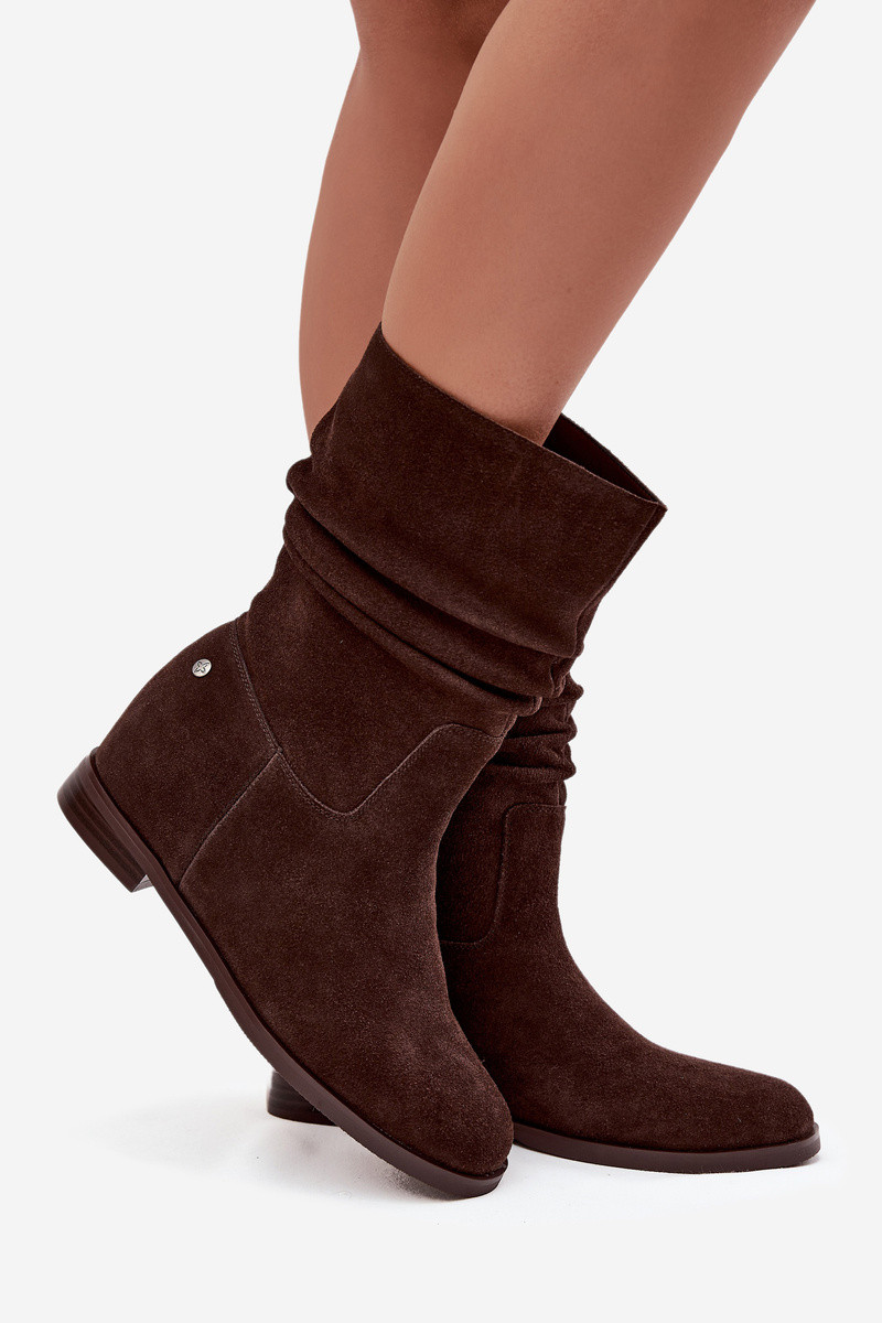 Skórzane Zamszowe Botki DamskiewithMarszczeniem Ocieplane Maciejka K7211-02 Czekoladowe