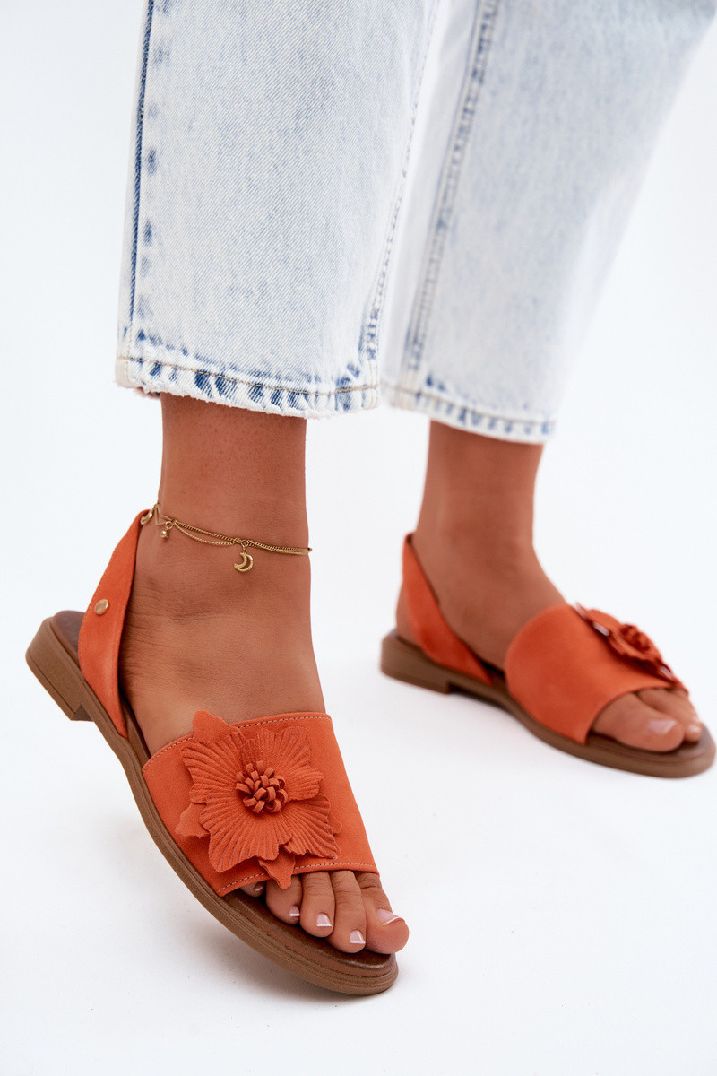 Skórzane Zamszowe Sandały Na Płaskim ObcasiewithOzdobnym Kwiatem Zazoo 407471 Pomarańczowe