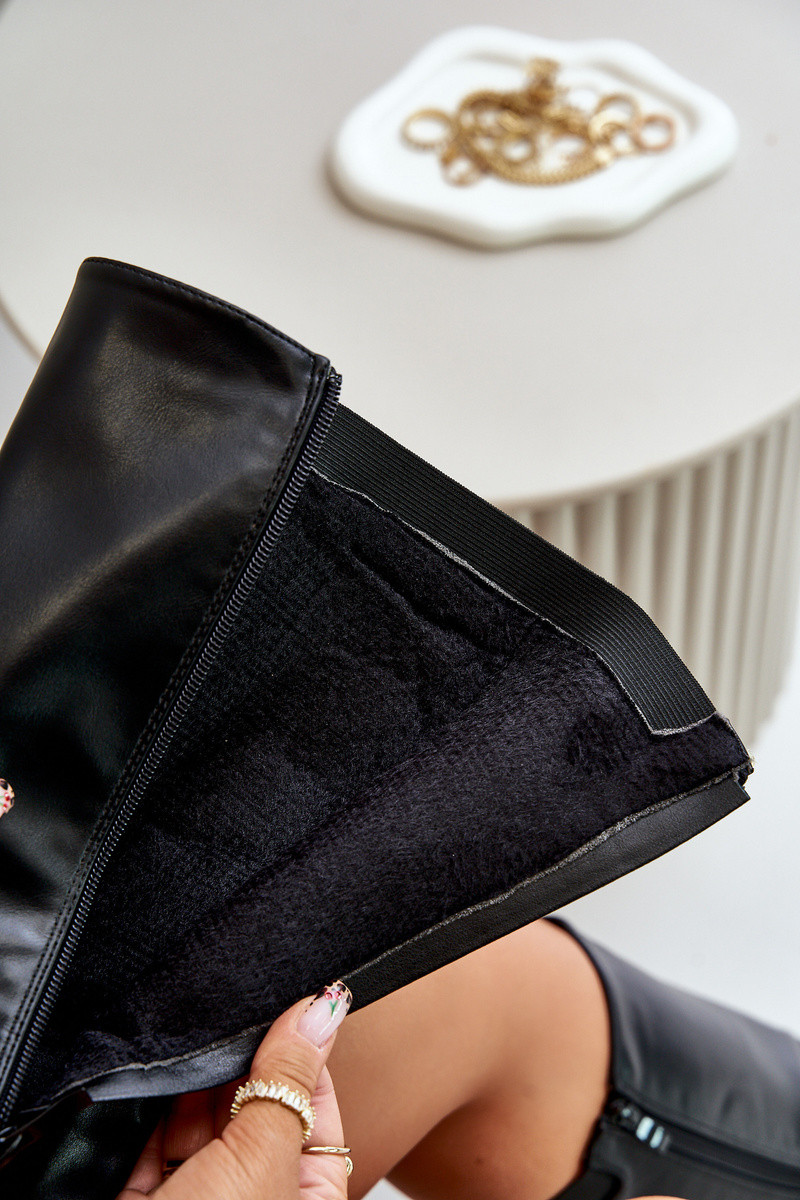 Damskie Ocieplane Kozaki Na Płaskim Obcasie Ze Złotą Klamrą Czarne Arsisna