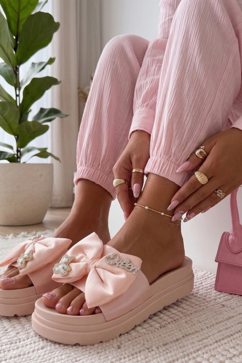 Różowe Klapki Na Platformie Z Kokardą Inès