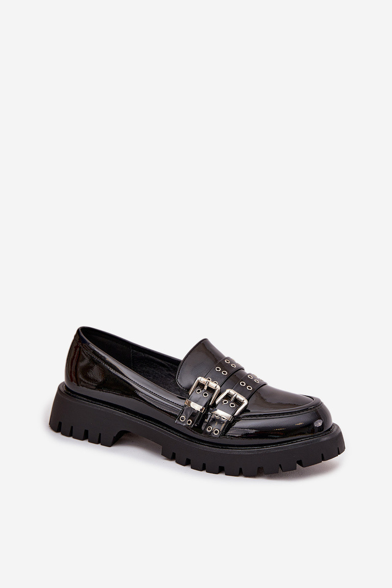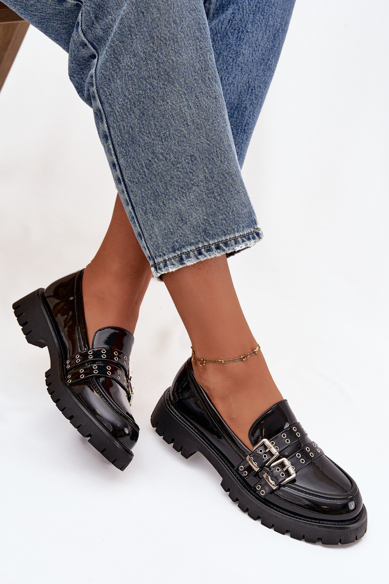 Mokasyny Damskie LakierowanewithPaskami I Srebrnymi Klamrami Czarne Gabrisse