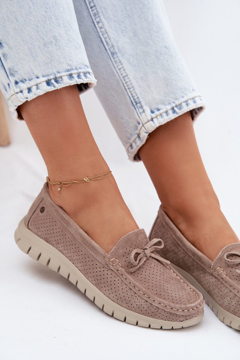 Beżowe mokasyny damskie z sztucznego zamszu z kokardkami Vinceza 95401
