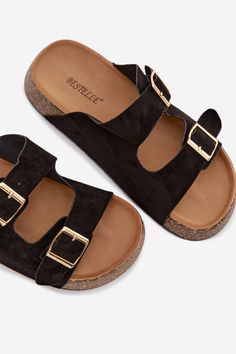 Klapki Damskie Na Korkowej Platformie Ze Złotymi Klamrami Czarne Tovessa