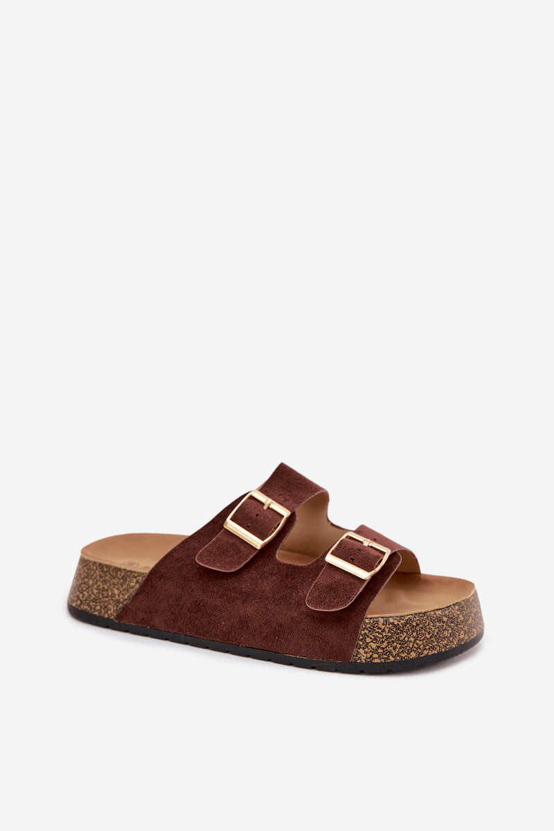 Klapki Damskie Na Korkowej Platformie Ze Złotymi Klamrami Jasnobeżowe Tovessa