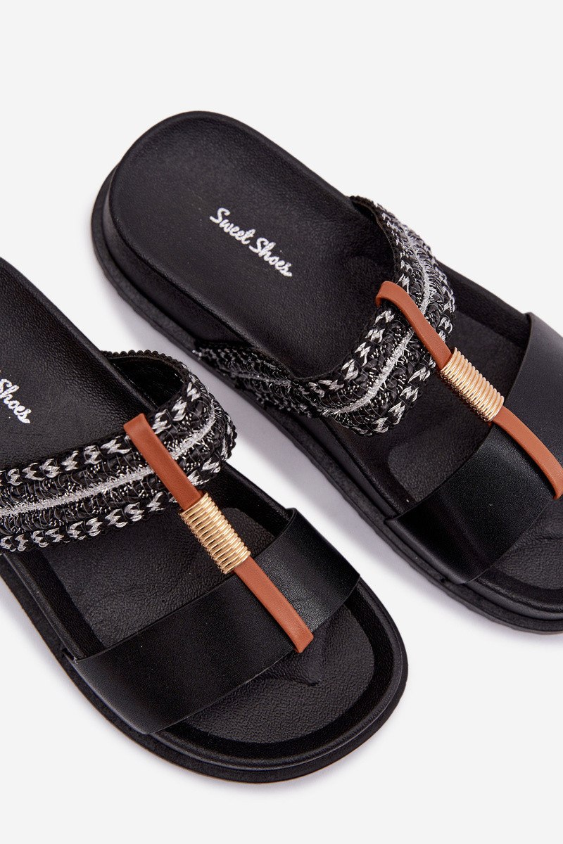 Klapki Damskie Na PlatformiewithPaskami I Złotym Detalem Czarne Tahlia