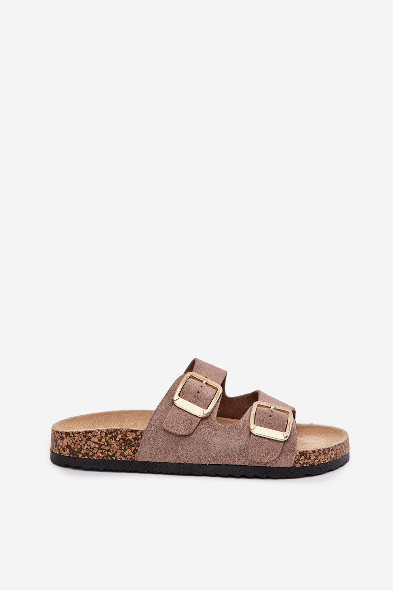 Damskie czarne klapki z sztucznej zamszowej skóry ze złotymi klamrami Vorella