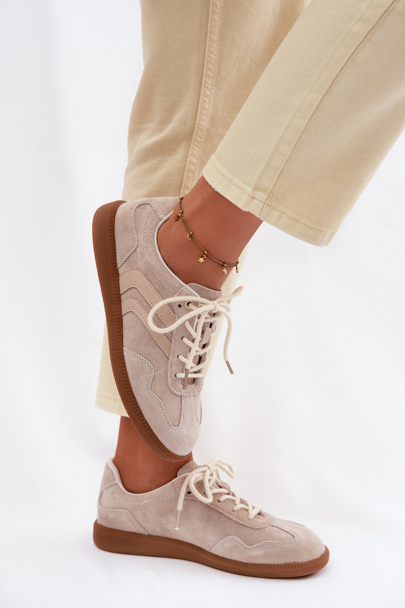 Skórzane Zamszowe Sneakersy Damskie Niskie Beżowe Perinae